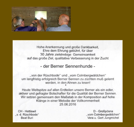 der Abholung "Rex v.d. Rüschbode" bei Beat Buri (Schweiz) am Wohnhaus angebracht.